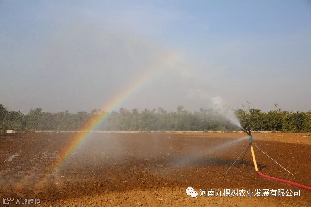 深埋地下的排水管道是早已经安装好的,只需在出水口处架一座三脚架,把喷枪接口装上即可。打开开关,水源源不断地喷射开来,射程大概有六七米远,我不由的感叹现在科技之先进,想起当年父母浇地时,要一根一根扯水管,还要一直不停挪动出水口,经常一块地浇下来,全身湿透。现在,有如此先进的技术,只要安装好,打开开关,就可以坐在一边等候,喷枪会旋转一周,把一片地均匀灌溉。
