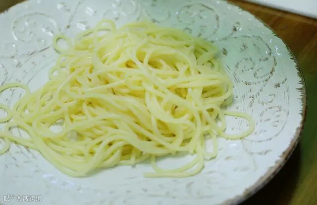 将煮好的意面过下温水,放入少量橄榄油搅拌均匀备用。
