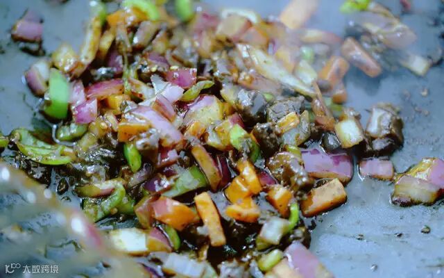 翻炒过程中,将老抽、黑胡椒汁、九棵树香辣香椿酱依次放入翻炒,出锅备用。