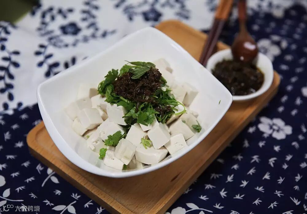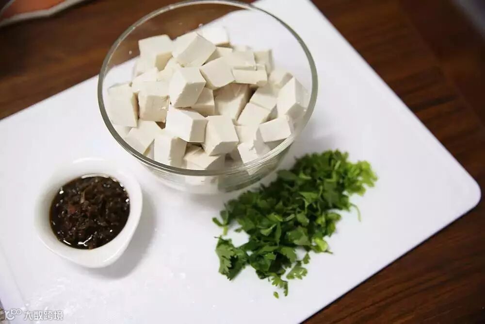 食材:豆腐一块500g、香椿酱100g、香菜一小把、盐10g、辣椒油10g