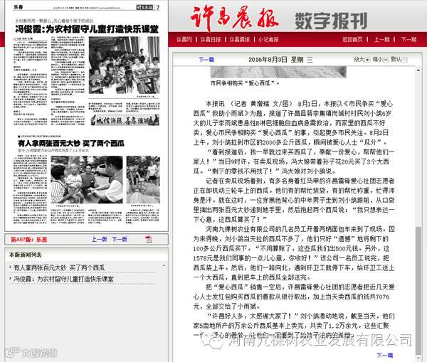 《许昌晨报》报道九棵树爱心事迹