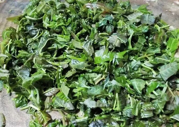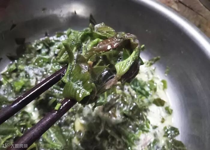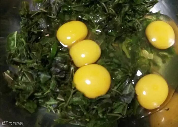 切碎后的香椿用开水烫过后加入鸡蛋,可根据食用量加鸡蛋数量。