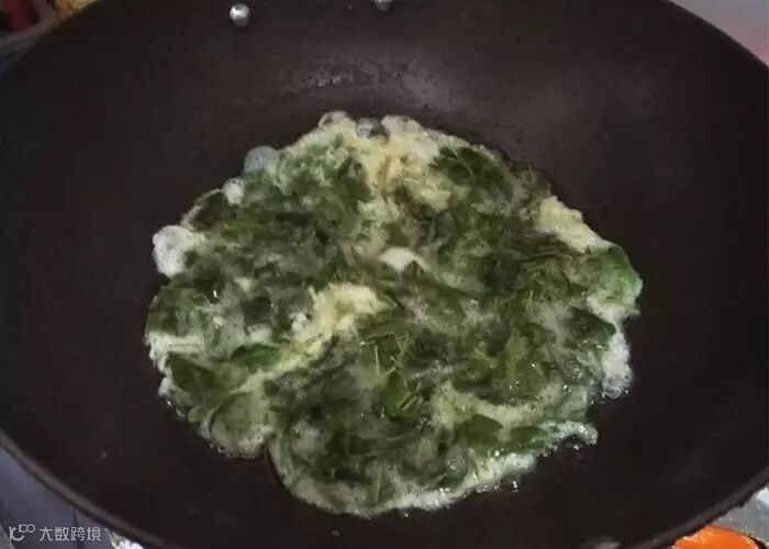 锅中加入三勺油,待油温七八十度时均匀倒入香椿蛋液。