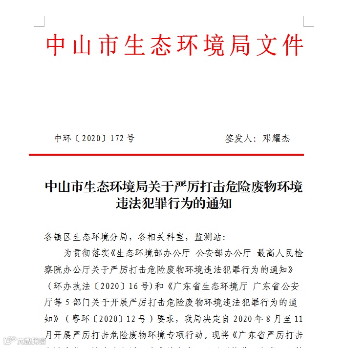 按照生态环境部与公安部、最高人民检察院《关于严厉打击危险废物环境违法犯罪行为的通知》和广东省生态环境厅、公安厅、人民检察院、交通运输厅、海事局等5部门联合印发《关于开展严厉打击危险废物环境违法犯罪行为的通知》要求,中山市生态环境局联合市公安局、市人民检察院、市交通运输局、市海事局决定在今年8月至11月期间,开展严厉打击危险废物环境违法犯罪联合行动。