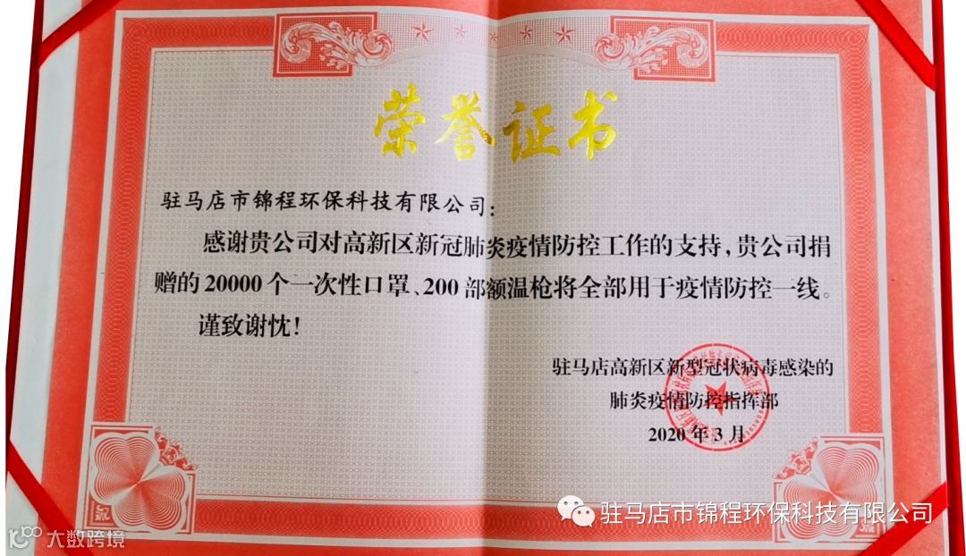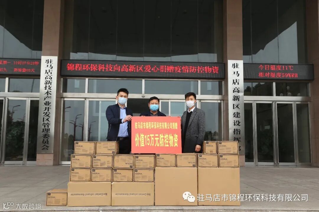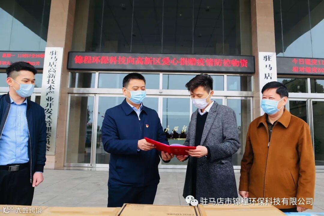 " 在疫情防控的关键时期,贵公司慷慨捐赠20000个一次性口罩、200部额温枪,用爱心、责任、担当,汇聚起众志成城、共克时艰的精神力量,进一步增强了全区上下勇往无前、战胜疫情的决心和信心。高新区党委、管委会代表全区广大党员干部群众对您的无私奉献表示感谢,并致以最崇高的敬意。" 3月2日,发自驻马店高新区疫情防控指挥部的一封感谢信,深情讲述了驻马店市锦程环保科技有限公司向该区捐赠防控物资,特别向该公司表达谢意的经过。