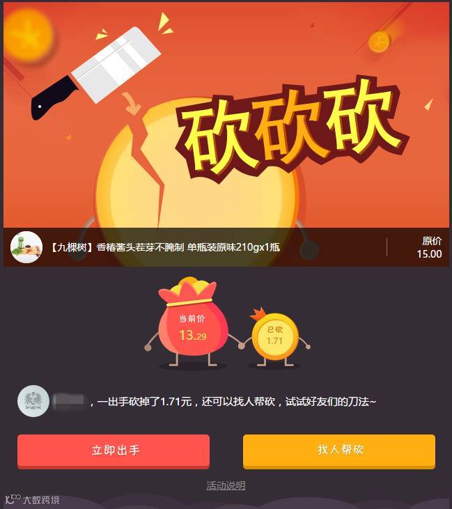 点击找人帮砍,寻找朋友帮忙砍价,最低可砍价至1元