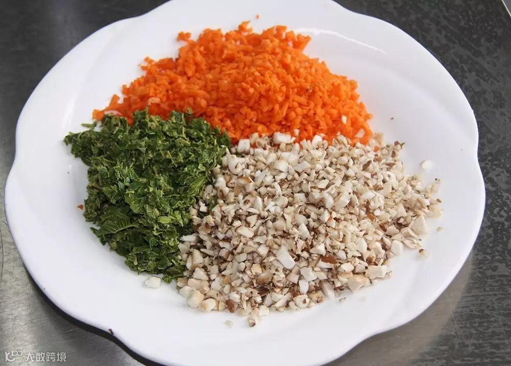 将香椿芽、胡萝卜、香菇切碎末