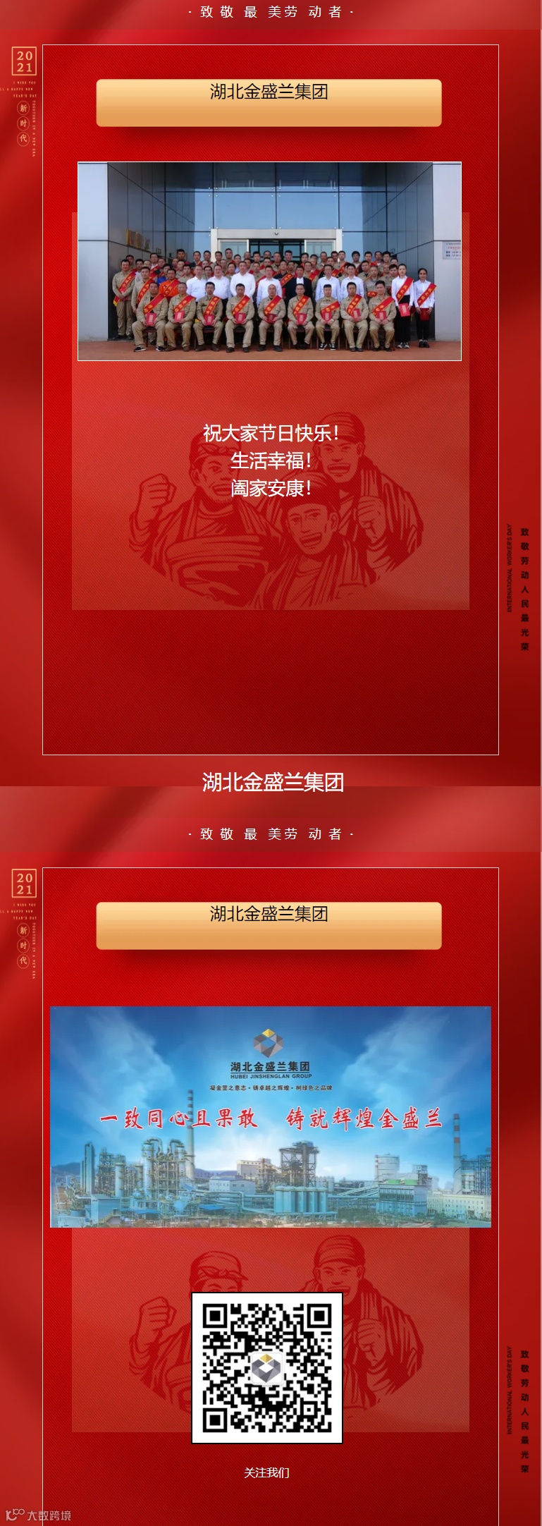 导读:值此“五一”国际劳动节,湖北金盛兰集团董事长陈龙官、总经理王永蓬代表公司董事会、党委、工会向全体员工致以节日的祝贺和诚挚的问候!