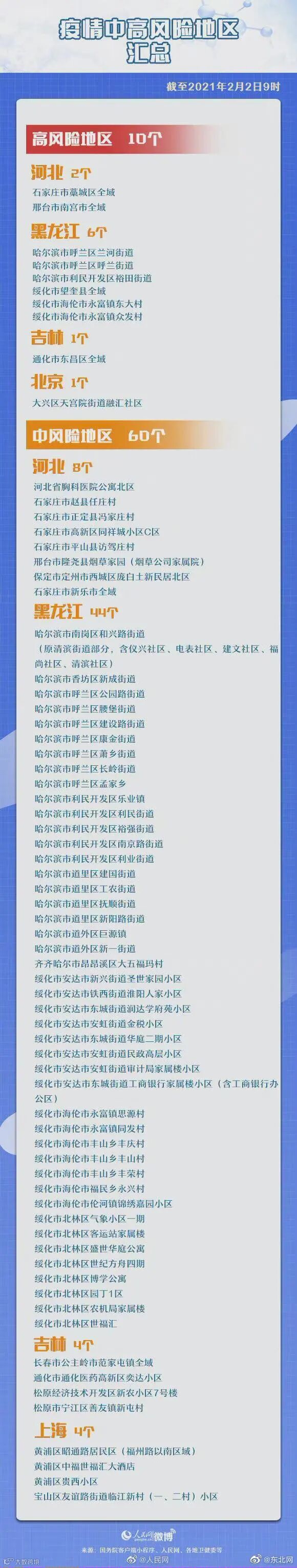 【10+60!#全国有10个高风险60个中风险地区#】截至2月2日9时,全国有10个高风险地区,60个中风险地区。#疫情中高风险地区汇总#↓↓ 不扎堆不聚集,做好个人防护!