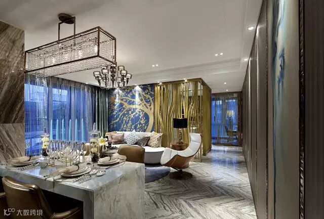 Art deco也被称为装饰艺术,以新颖的造型、艳丽夺目的色彩以及豪华材料的运用,成为一种摩登艺术的符号。独特的建筑风格,新颖的造型、艳丽夺目的色彩配合丰富的流线型线条装饰逐层展现退宿的结构轮廓,运用几何学特有的构图解开高端阶层神秘的高贵感。空间摩登的形体又赋予古老的、贵族的气质,代表的是一种复兴的城市精神。