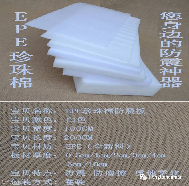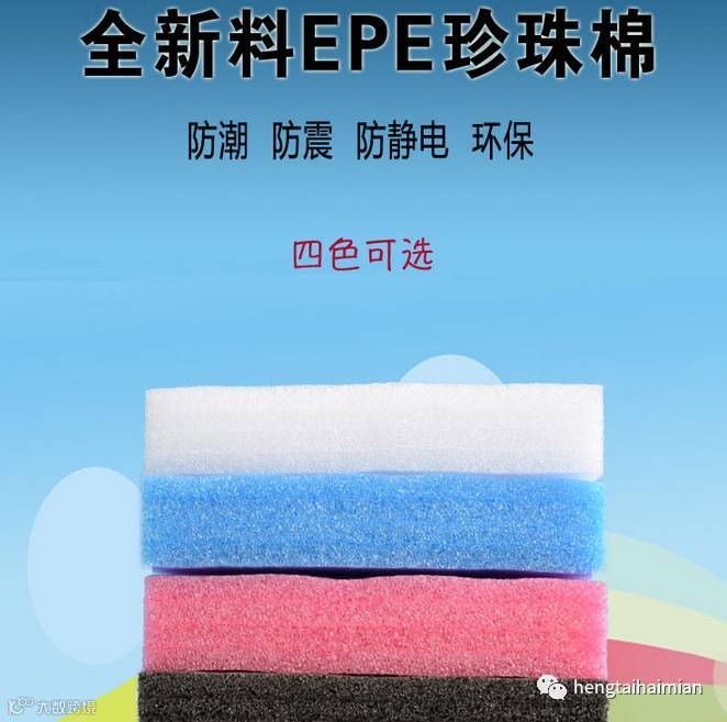 一种具有高强缓冲、抗震能力的新型环保发泡材料 。它柔韧、质轻,富有弹性,能通过弯曲来吸收和分散外来的撞击力,达到缓冲的效果,克服了普通发泡胶易碎、变形、回复性差的缺点。同时EPE具有保温、防潮、隔热、隔音、防摩擦、抗老化、耐腐蚀等一系列优越的使用特性。加入静电剂的粉红色EPE原材,具有显著的防静电性能。EPE还是一种可以回收的环保材料。EPE除用于包装外,还可能用于建筑,机电工程等广泛领域。良好的抗冲击性和缓冲效果的不变性等等优点使得其广泛运用于高档家具、家用电器、仪器仪表、工艺礼品、木制品、玻璃陶瓷、建筑防水、地毯夹层、隔音、旅游箱包、精密零配件、各种管道保温等领域。