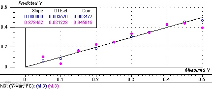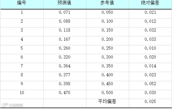 混合物中的B组分的含量非常低,仅有千分之几的含量,由于数据的梯度分布是比较合理的。由模型各项指标显示,模型非常好,如果能够继续增加建模样品的相关性会得到进一步的提高。对10个验证数据的预测偏差达到了0.025,说明GSA金光近红外光谱仪能够检测到混合物中的千分含量的B组分,用于定量或定性分析完全没有问题。