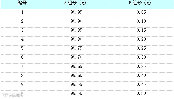 本次实验所用样品共两种物料,A和B,均为100目的粉末状态。按照一定的比例配制混合样品, A和B混合后的总量为100g/个样品,共配制样品10个,如下表所示。