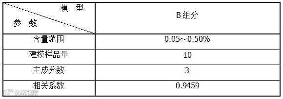 从PLS1回归模型上看,B组分含量指标的交互验证的预测值与参考值间呈现明显的线性关系,两者的相关系数都达到了0.94以上,说明利用GSA金光近红外光谱仪检测混合物中的B组分含量是完全可行的。模型参数见表1所示。