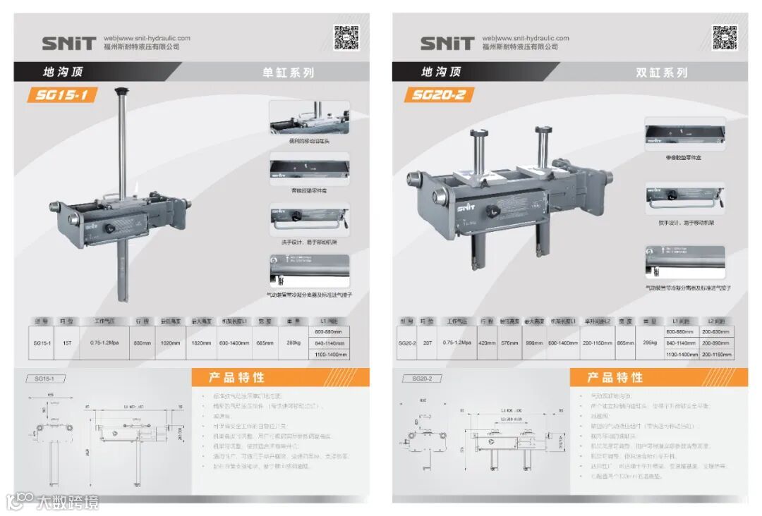 斯耐特公司新研发推出两款地沟顶设备SG15-1/SG20-2,并提供多场景使用的顶升托架等配件。整机轻量化设计,占用空间小,给操作员更加自由灵活的使用体验。采用0.8-1.2Mpa气源作为驱动能源,更安全,环保,绿色。整体安装、操作简便,提升维修效率。