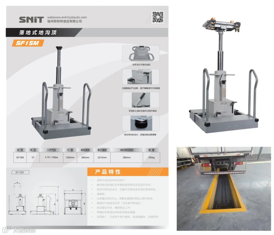 2024年1月新研发上市落地式地沟顶设备SF15M,对于老旧的地沟改造提供了更方便的选择。此款设备可以在旧地沟底部平整情况下,直接落地使用,15吨的举升力,完全满足商用车的维修需求。