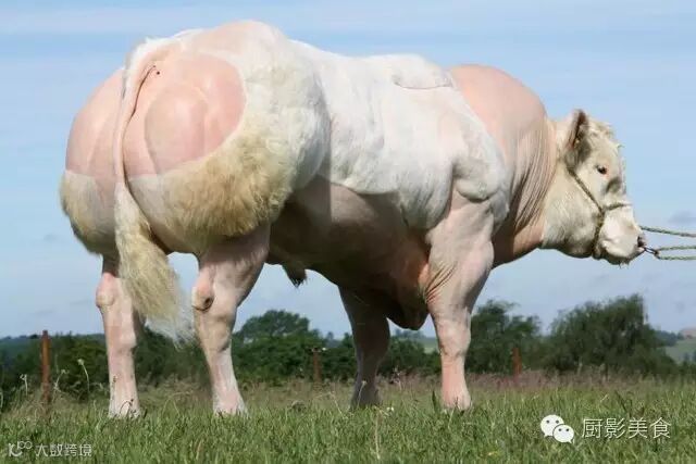 据说比利时蓝牛之所以长成这样,是因为体内一种名为“肌肉生长抑制素”的蛋白质基因受到了抑制,无法正常发挥作用。不过这个并不重要啦,对吃货们来说,能够提供好吃的牛肉就是王道。