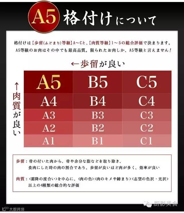 和牛等级分类:日本的牛肉[歩留等级]分为A,B,C.也就是食用 比[肉质等级](油花)分为1~5也就是油花等级肉质的BMS霜降度(Beef Marbling Standard)。