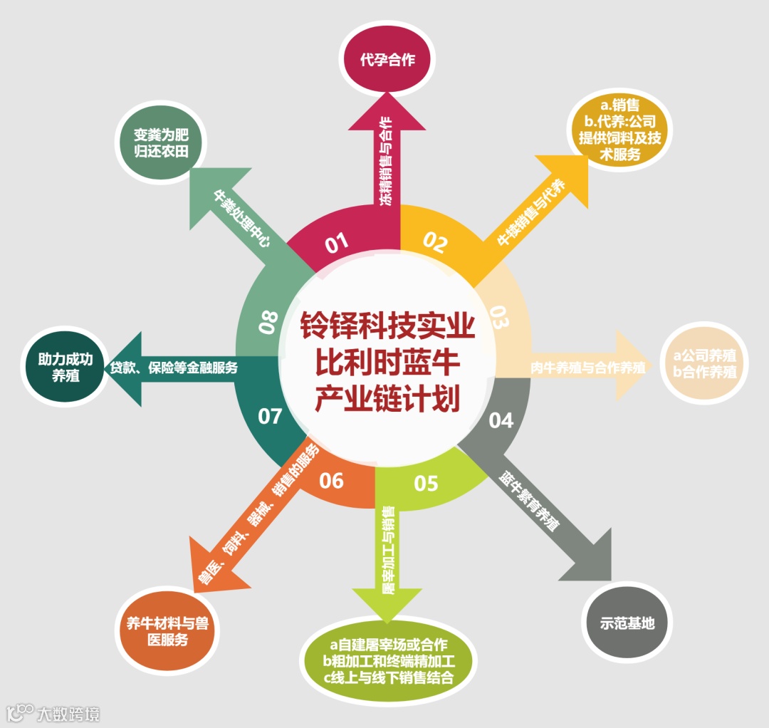 铃铎科技实业比利时蓝牛产业链计划含八个方面,含育种冻精生产、牛犊生产、肉牛育肥、屠宰销售、饲料及养殖材料供应、金融服务、牛粪处理、养殖研究基地。