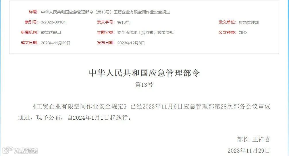 为落实《工贸企业有限空间作业安全规定》(应急管理部令第13号)要求,应急管理部组织制定了《工贸企业有限空间重点监管目录》。现印发给你们,请遵照执行。