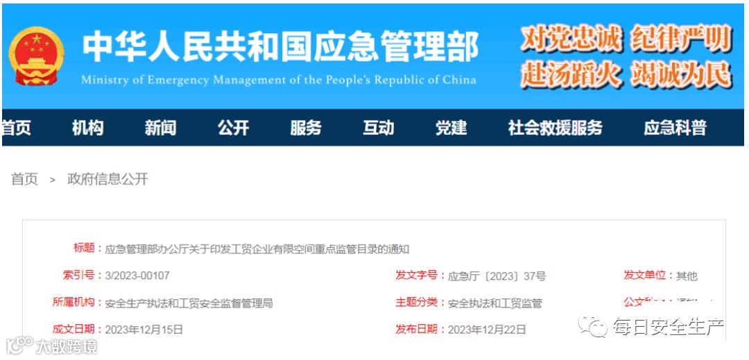 应急管理部办公厅关于印发工贸企业有限空间重点监管目录的通知