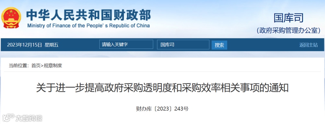12月14日,财政部发布《关于进一步提高政府采购透明度和采购效率相关事项的通知》(财办库〔2023〕243号),本通知自印发之日起施行。明确:
