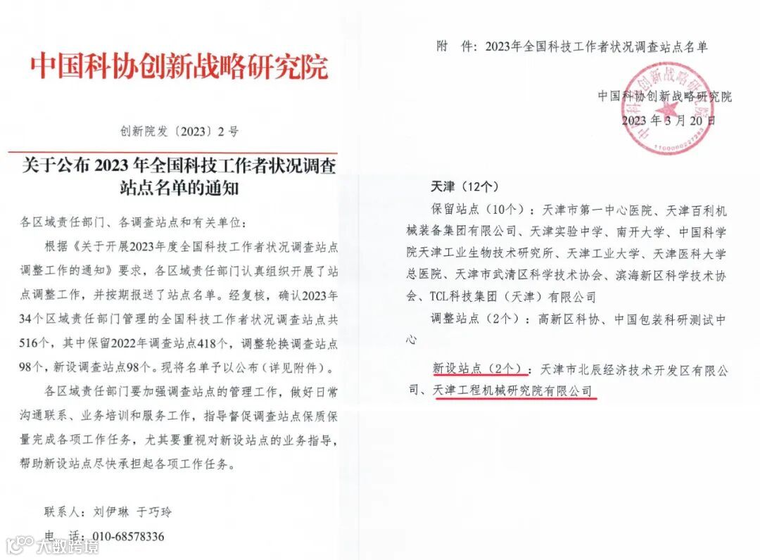 3月20日,中国科协发布《关于公布2023年全国科技工作者状况调查站点名单的通知》,天工院入选新一批全国科技工作者状况调查站点,此次全国新设调查站点98个。