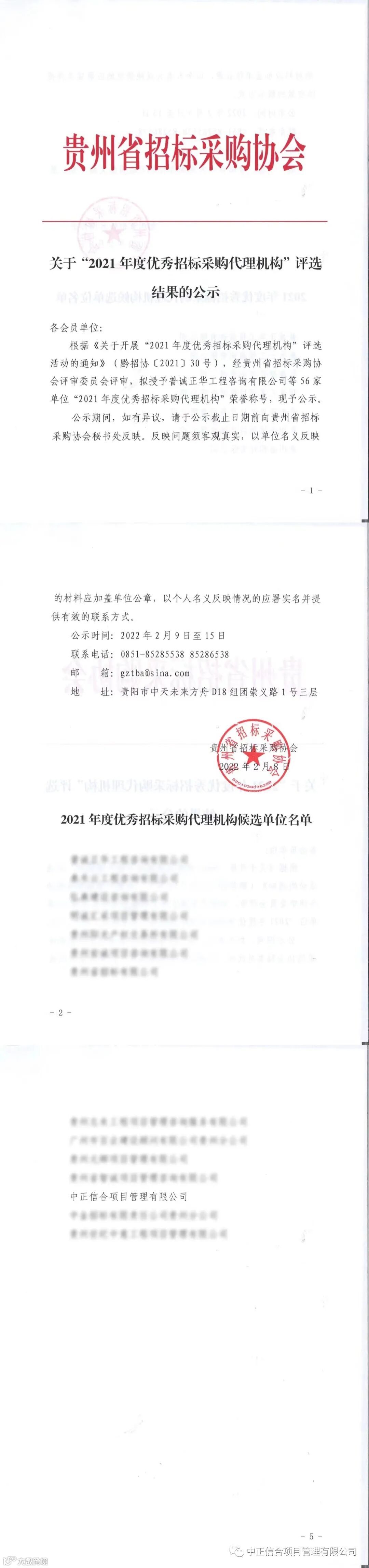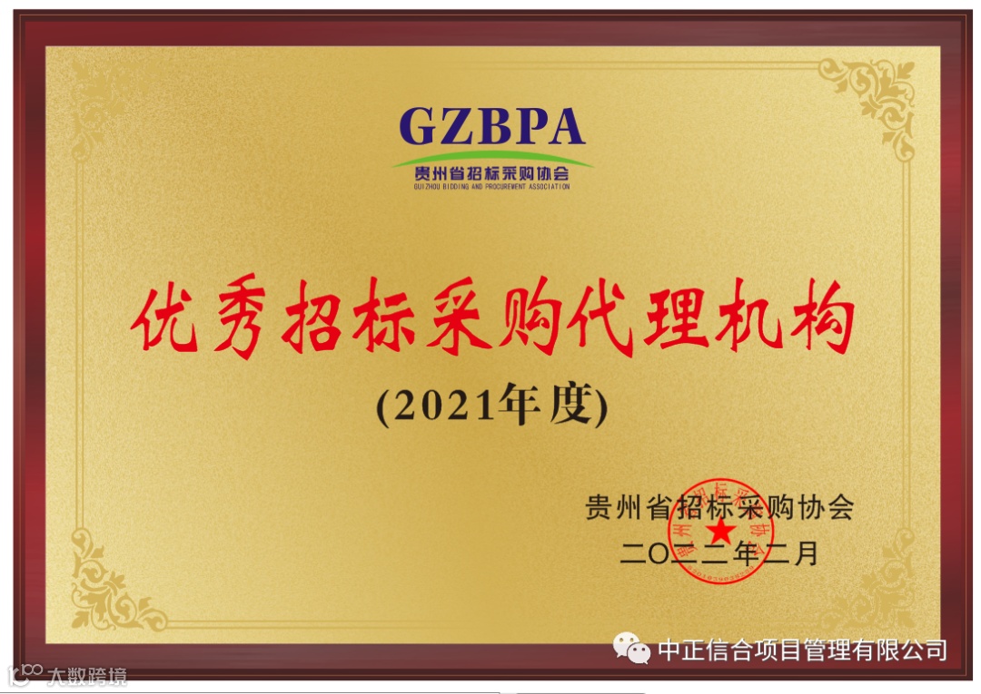 本次优秀招标采购代理机构评选,面向协会内全部会员单位,总计五百五十余家。经贵州省招标采购协会评审委员会评审、意见征求和社会公示等程序,中正信合脱颖而出,获得“2021年度优秀招标代理机构”荣誉称号,这是对中正信合实力的肯定,更是对中正信合招标采购代理工作的支持和认可。