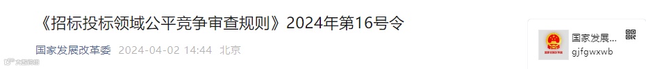 国家发展改革委、住房城乡建设部等8部门联合印发《招标投标领域公平竞争审查规则》(国家发展改革委令第16号),自2024年5月1日起施行。