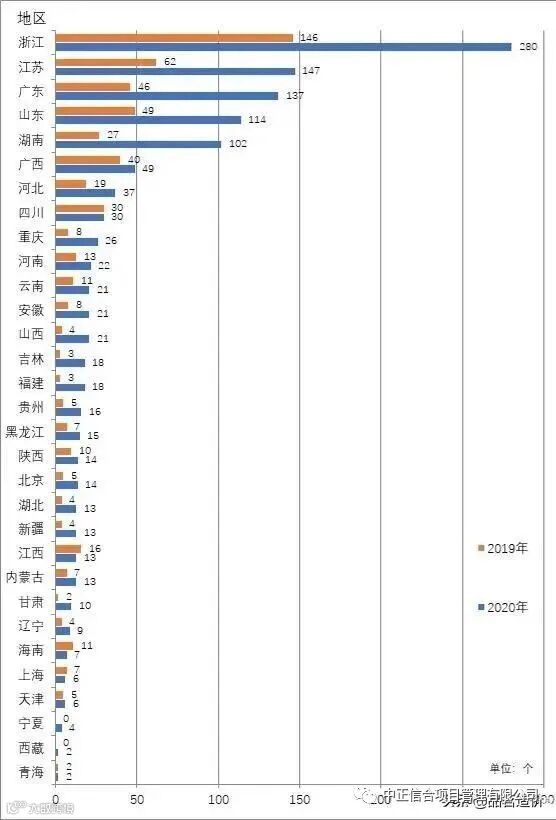 关于全咨在全国各地的项目落地实施状况详见《2019、2020年全国全过程工程咨询服务项目招标情况统计图》(图1)