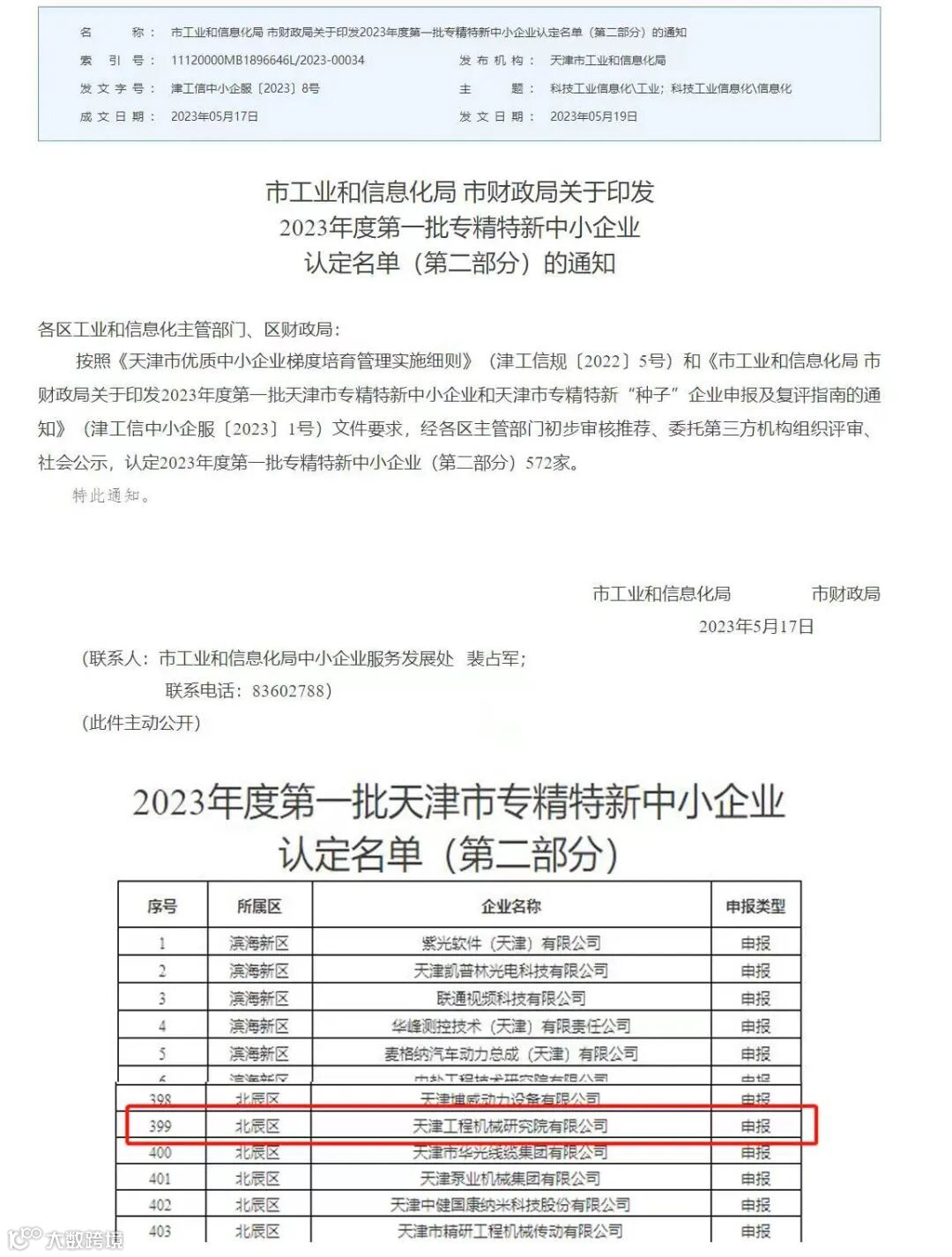 近日,天津市工业和信息化局对2023年第一批专精特新中小企业认定名单(第二部分)进行了公布,天工院成功被认定为天津市“专精特新中小企业”。