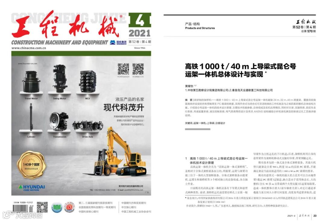 不约而同!2021年4月,《工程机械》独家刊发著名高铁架桥装备专家黄耀怡教授的力作《高铁1000t/40m上导梁式昆仑号运架一体机总体设计与实现》。黄教授是该机技术方案的提出人并直接指导完成了该机的技术设计。论文从专业技术角度对昆仑号运架一体机的技术设计原理、主要技术性能参数、总体组成及实机应用情况,特别是对主梁、支腿系统、前后车走行系统、吊梁起重系统、液压控制系统、电气系统等的设计,以及典型的架梁过孔工艺做了详细的论述和讲解,实为科技人员学习参考的佳作。