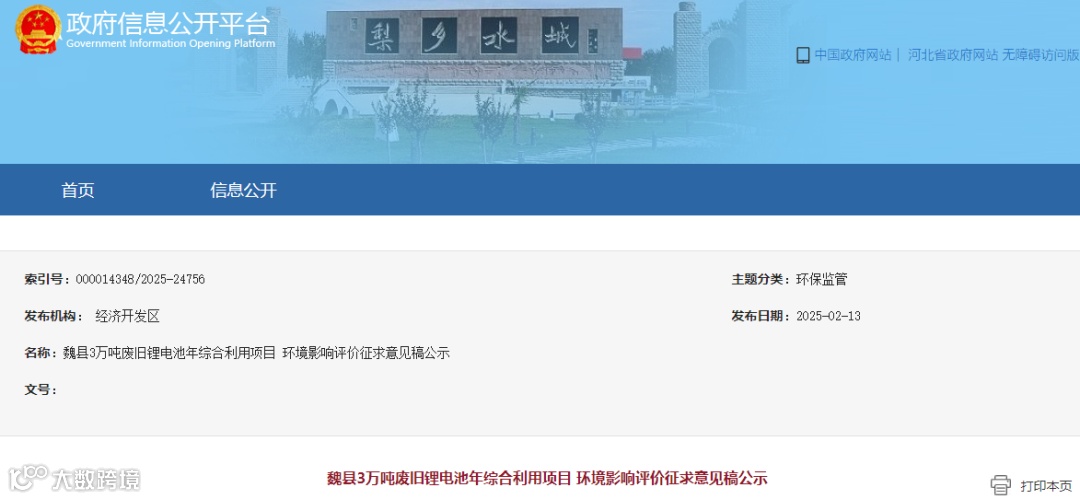 近日,河北邯郸市魏县党政网就“魏县3万吨废旧锂电池年综合利用项目”进行了环境影响评价征求意见的公示。
