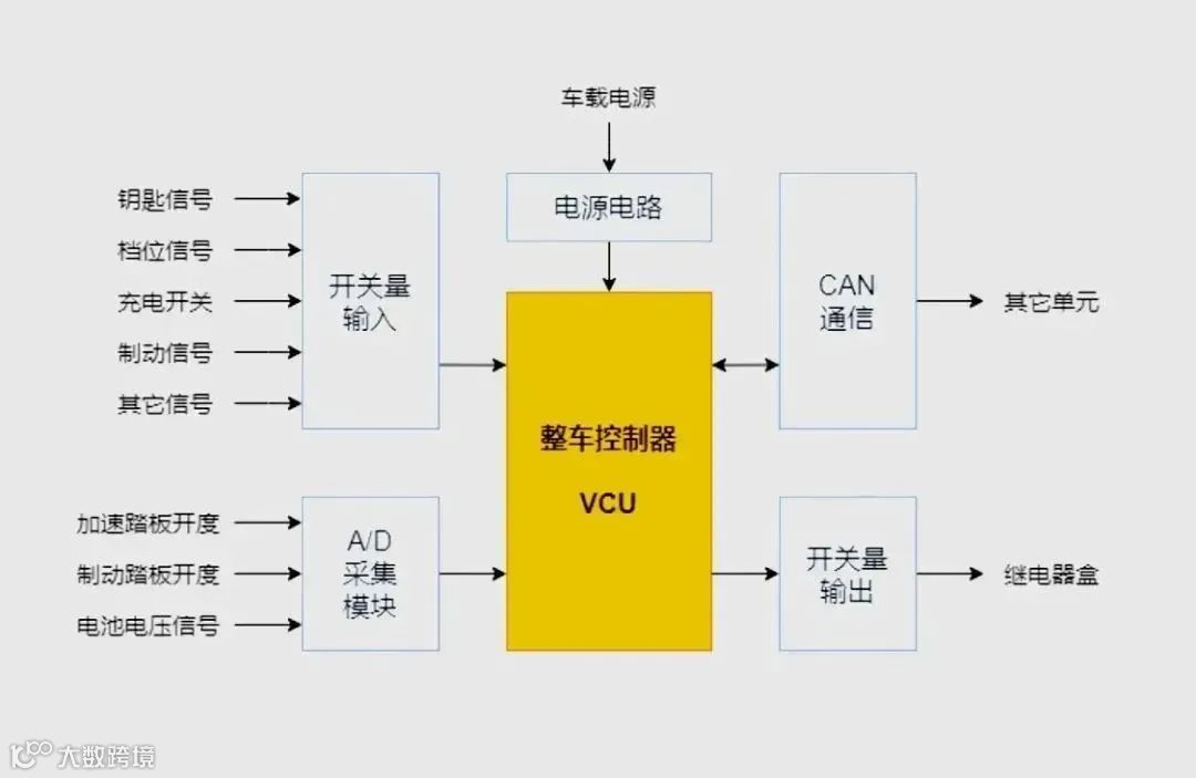 车辆行驶过程中,需要一个与驾驶员进行指令互动的窗口,这个窗口就是整车控制器VCU(Vehicle control unit),VCU负责接收来自驾驶员的各种驾驶操作指令和配置功能操作的需求,如上电、加速、制动踏板等各种信号,并结合车辆其它系统发出的操作指令或协控信息,以及各部件传感器反馈的各种车况信号,实现对整车和各部件工况的分析,形成可以确保车辆安全行驶的指令,以达到各个控制系统器执行动作的目的。