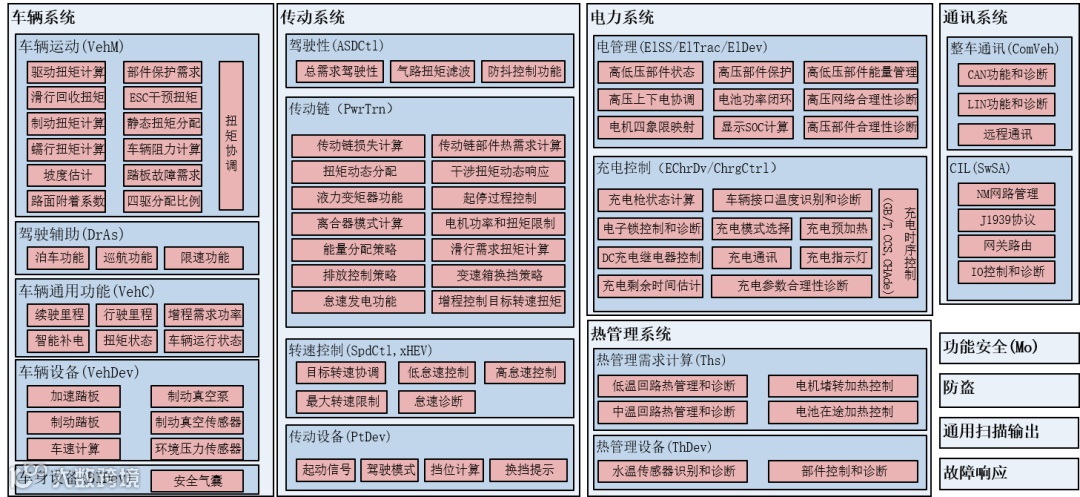 从系统功能划分角度考虑,可以把VCU的功能划分为:车辆系统、传动系统、电力系统、热管理系统,以及OBD诊断、通讯、安全监控等系统功能。VCU的主要功能如下。