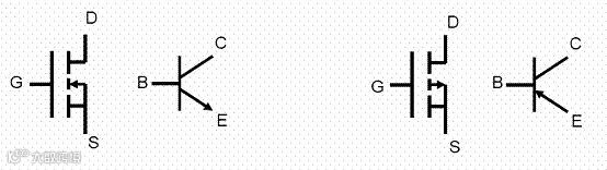 1).场效应管的源极S、栅极G、漏极D分别对应于三极管的发射极e、基极b、集电极c,它们的作用相似,图1-6-A所示是N沟道MOS管和NPN型晶体三极管引脚,图1-6-B所示是P沟道MOS管和PNP型晶体三极管引脚对应图。
