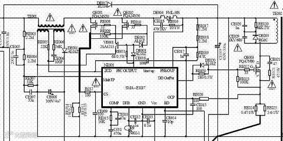 海信液晶电视32寸~46寸均采用该开关电源,电源采用了复合集成电路SMA—E1017(PFC和PWM共用一块复合激励集成电路),同样该PFC开关电源部分也是一个并联的开关电源,图3-4所示。TE001是储能电感、DE004是开关电源的整流管、QE001、QE002是两只并联的大功率MOS开关管。该集成电路的PFCOUTPUT端子是激励输出,,RE008、RE009、RE010、VE001、DE002、RE011、DE003组成QE001和QE002的灌流电路。