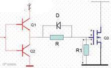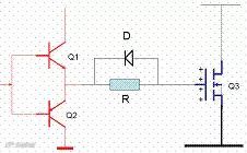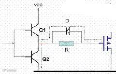 由于充电限流电阻的增加,使在激励方波负半周时Q2导通时放电的速度受到限制(充电时是VCC产生电流,放电时是栅极所充的电压VGS产生电流,VGS远远小于VCC,R的存在大大的降低了放电的速率)使MOS管的开关特性变坏,为了使R阻值在放电时不影响迅速放电的速率,在充电限流电阻R上并联一个形成放电通路的二极管D,图2-3-B所示。此二极管在放电时导通,在充电时反偏截止。这样增加了充电限流电阻和放电二极管后,既保证了MOS管的安全,又保证了MOS管,“开”与“关”的迅速动作。