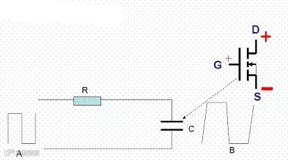 灌流电路MOS管和普通晶体三极管相比,有诸多的优点,但是在作为大功率开关管应用时,由于MOS管具有的容性输入特性,MOS管的输入端,等于是一个小电容器,输入的开关激励信号,实际上是在对这个电容进行反复的充电、放电的过程,在充放电的过程中,使MOS管道导通和关闭产生了滞后,使“开”与“关”的过程变慢,这是开关元件不能允许的(功耗增加,烧坏开关管),如图所示,在图2-1中 A方波为输入端的激励波形,电阻R为激励信号内阻,电容C为MOS管输入端等效电容,激励波形A加到输入端是对等效电容C的充放电作用,