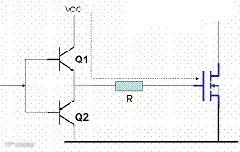 由于MOS管在制造工艺上栅极S的引线的电流容量有一定的限度,所以在Q1在饱和导通时VCC对MOS管栅极S的瞬时充电电流巨大,极易损坏MOS管的输入端,为了保护MOS管的安全,在具体的电路中必须采取措施限制瞬时充电的电流值,在栅极充电的电路中串接一个适当的充电限流电阻R,如图2-3-A所示。充电限流电阻R的阻值的选取;要根据MOS管的输入电容的大小,激励脉冲的频率及灌流电路的VCC(VCC一般为12V)的大小决定一般在数十姆欧到一百欧姆之间。