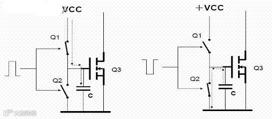 当激励方波信号的正半周来到时;晶体三极管Q1(NPN)导通、Q2(PNP)截止,VCC经过Q1导通对MOS开关管Q3的栅极充电,由于Q1是饱和导通,VCC等效是直接加到MOS管Q3的栅极,瞬间充电电流极大,充电时间极短,保证了MOS开关管Q3的迅速的“开”,如图2-2-A所示(图2-2-A和图2-2-B中的电容C为MOS管栅极S的等效电容)。