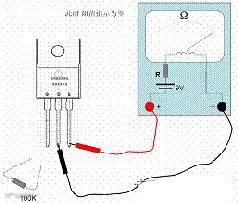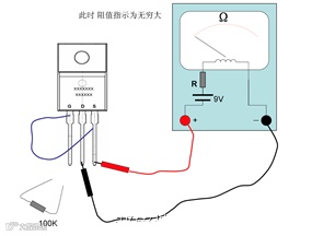 保持上述状态;此时用一只100K~200K电阻连接于栅极和漏极,如图5-4所示;这时表针指示欧姆数应该越小越好,一般能指示到0欧姆,这时是正电荷通过100K电阻对MOS管的栅极充电,产生栅极电场,由于电场产生导致导电沟道致使漏极和源极导通,所以万用表指针偏转,偏转的角度大(欧姆指数小)证明放电性能好。