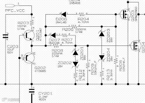 图3-3所示;是三星V4屏开关电源PFC激励部分电原理图,可以看出该V4屏电路激励部分原理相同于V2屏。只是在每一只大功率MOS开关管的栅极泄放电阻(R209、R206)上又并联了过压保护二极管;ZD202、ZD201及ZD204、ZD203