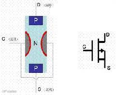 同样用上述相同的方法在一块掺杂浓度较低的N型半导体硅衬底上,用半导体光刻、扩散工艺制作两个高掺杂浓度的P+区,及上述相同的栅极制作过程,就制成为一个P沟道(PNP型)增强型MOS管。图1-2所示A 、B分别是P沟道MOS管道结构图和代表符号。