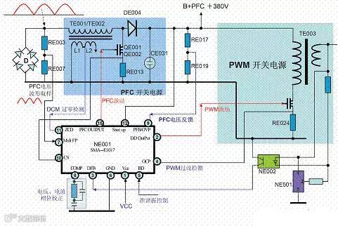 图3-4所示原理图是PFC开关电源及PWM开关电源的电原理图,该电路中的集成电路MSA-E1017是把PFC部分的激励控制和PWM部分激励控制复合在一块集成电路中,图3-6是原理框图,图中的QE003及TE002是PWM开关电源的开关管及开关变压器,RE050是QE003的充电限流电阻、DE020是其放电二极管。