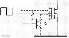 图中 D为充电二极管,Q为放电三极管(PNP)。工作过程是这样,当激励方波正半周时,D导通,对MOS管输入端等效电容充电(此时Q截止),在当激励方波负半周时,D截止,Q导通,MOS管栅极S所充电荷,通过Q放电,MOS管完成“开”与“关”的动作,如图2-4-B所示。此电路由激励信号直接“灌流”,激励信号源要求内阻较低。该电路一般应用在功率较小的开关电源上。