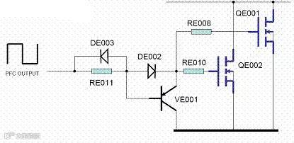 从等效电路图来分析,集成电路的激励输出端(PFCOUTPUT端子),输出方波的正半周时DE002导通,经过RE008、RE010对MOS开关管QE001和QE002的栅极充电,当激励端为负半周时,DE002截止,由于晶体三极管VE001是PNP型,负半周信号致使VE001导通,此时;QE001和QE002的栅极所充电荷经过VE001放电,MOS管完成“开”、“关”周期的工作。从图3-5的分析中,RE011作用是充电的限流电阻,而在放电时由于VE001的存在和导通,已经建立了放电的回路,DE003的作用是加速VE001的导通,开关管关闭更加迅速。