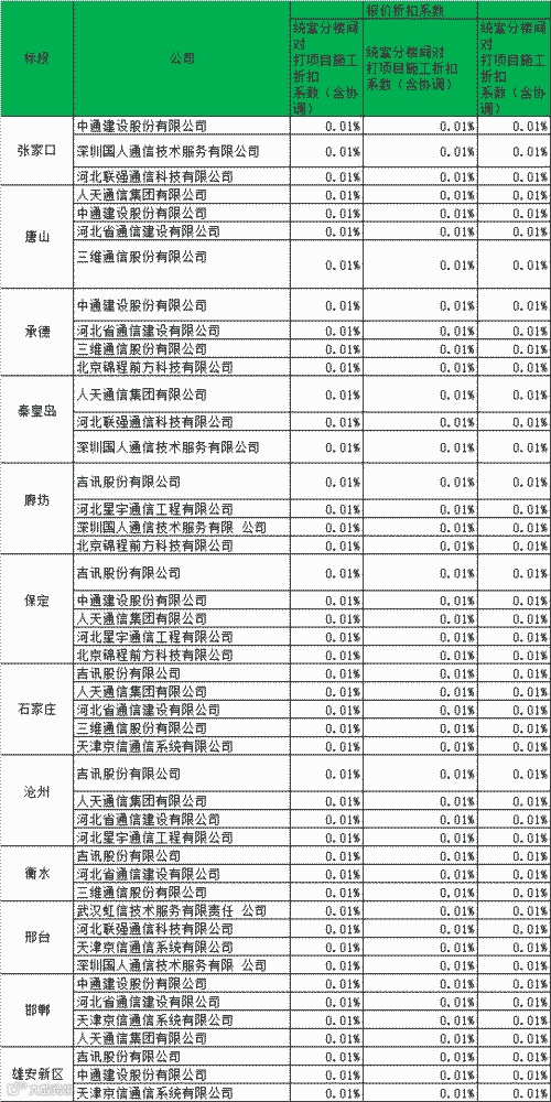 近日,中国铁塔股份有限公司河北省分公司2021年室内分布施工集约化电商采购项目中标结果公示。该项目共划分为12个标段,46个份额,最高投标限价6%、6%、11%,最终11家企业中标,而这11家公司竟然全是以0.01%的折扣中标。