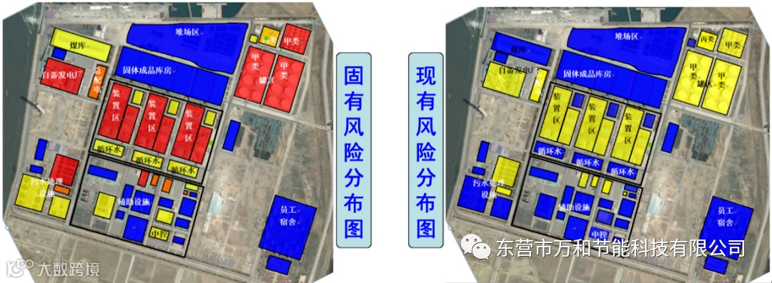 目前,大部分企业展示的风险分布图,均是针对固有风险,而不是针对现有风险(因现有风险尤其是其中的重大、较大风险是有时效性的,一般仅会存在一段时间),即在企业的厂区平面布置图上,将各单元的固有风险分别以“红、橙、黄、蓝”四色进行标色。如果企业发生了重大变更等,可能会导致某些单元的固有危险性发生变化,此时风险分布四色图也会相应发生变化。