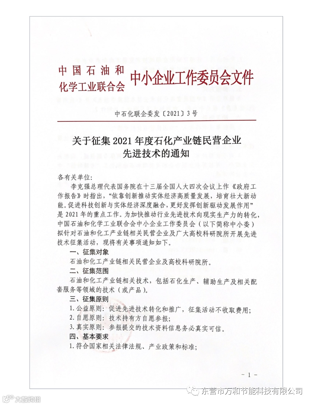 》,针对石油和化工产业链相关民营企业及广大高校科研院所开展先进技术征集